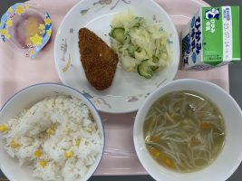 7/7 コーンごはん、牛乳、スズキフライ、キャベツの香味漬け、七夕そうめん汁、七夕ゼリー