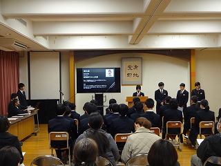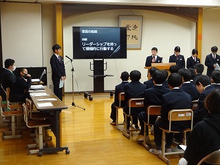 実行委員がスキー学校の目的やスローガン、持ち物などを説明しました。このスキー学校でも、積極的にいろんな役割を引き受けて、協力することや努力することの大切さを学んで、一段とステップアップしてください。スキーの技術の成長など、目に見えるものも大切ですが、それ以上に、思いやりやいたわりなど、目には見えないものを成長させてほしいと思います。