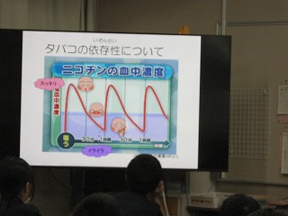 10月14日(火)6校時、1年生を対象に喫煙防止教室を行いました。丹波篠山市健康課から2名の保健師さんにお世話になり、タバコの有害物質など、講話をしていただきました。タバコのパッケージ、海外との比較など、多様な視点でお話しいただき、正しく知り、健康について考える時間となりました。